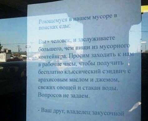 Какие чувства вызывает у вас данное сообщение, размещенное за стеклом одного из кафе? Удивление: а ведь этот мир не так уж плох.