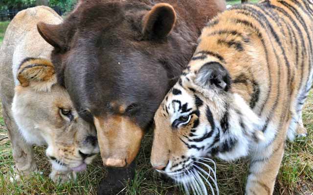 Считается, что для тигра, льва и медведя совместное существование (то есть, в одном вольере или клетке) – это что-то из области фантастики. Однако эта троица напрочь разрушила стереотипы. Глядя на них, возникает ощущение, что животные как будто бы сошли со страниц знаменитой «Книги джунглей» Рерьярда Киплинга.