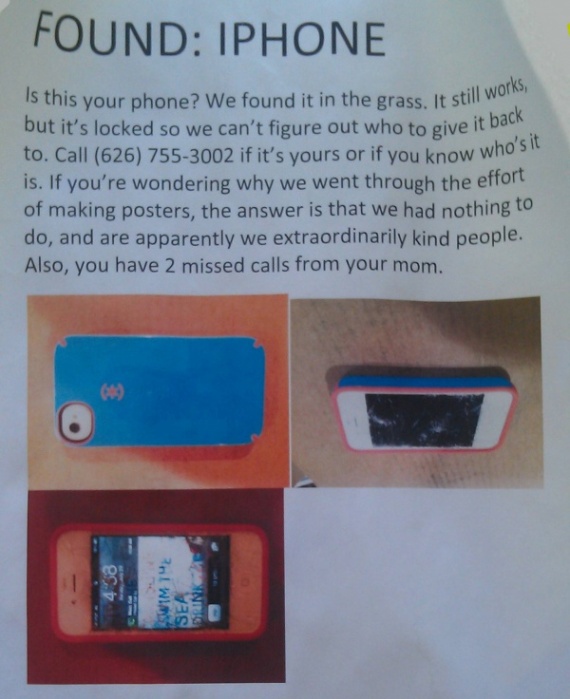 «Это ваш телефон? Мы нашли его в траве. Он работает, но заблокирован, поэтому не смогли узнать, кому его возвращать. Позвоните по номеру (626) 755-3002, если телефон — ваш, или если вы знаете, кому он принадлежит. Если вас интересует, почему мы решили расклеить объявления с фотографиями, отвечаем: да, нам действительно нечем заняться. И еще мы очень добрые люди. Кстати, у вас два пропущенных от мамы.»